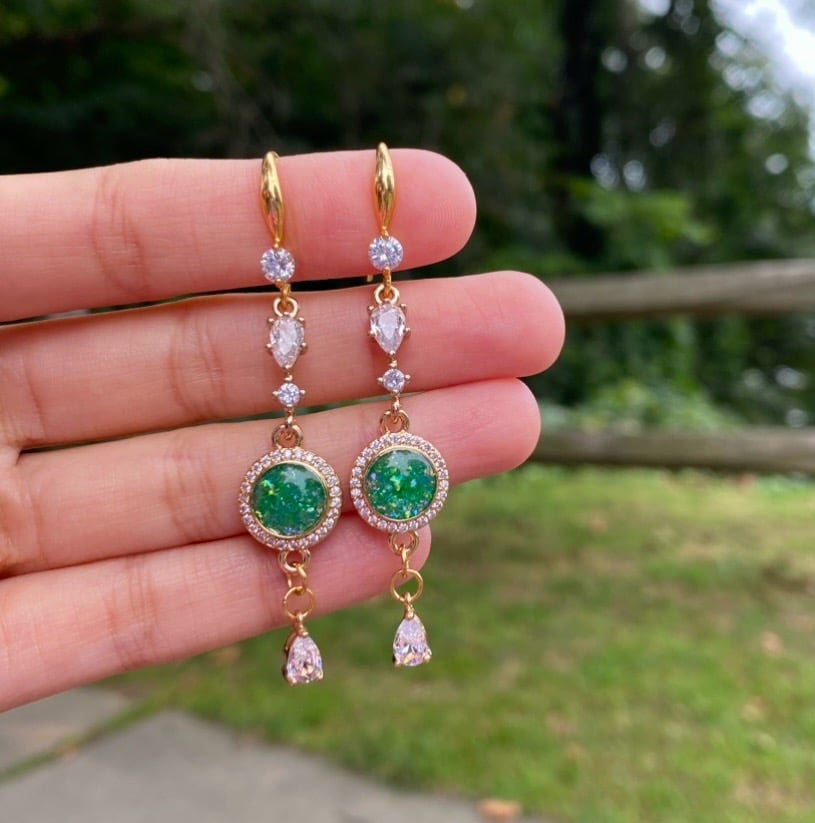 Emerald color sparkle pendant: Gold plated over copper, Zircon border, Resin pendant center
