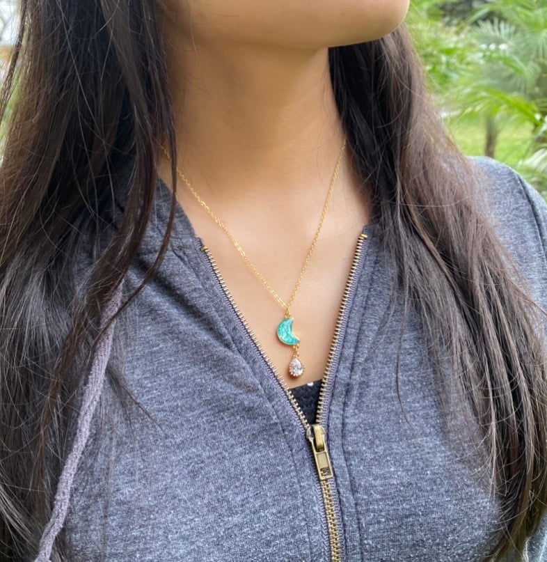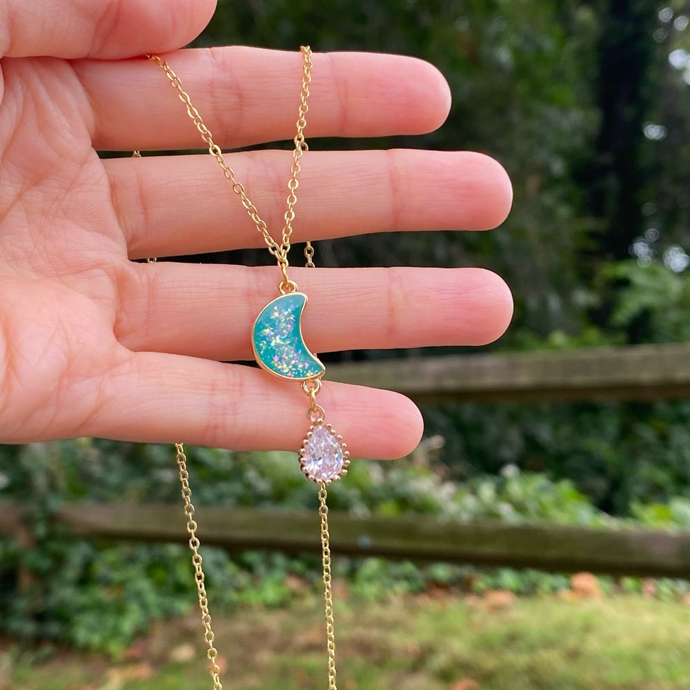 Minty Moon Pendant: Gold plated over copper, Resin pendant center